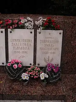 The cemetery was created from land set aside in 1903, with the first burial taking place on 28 May 1905. It was mainly a burial location for the poor of the area, as well as soldiers and sailors who died in the First World War.[1] It rose to prominence in the Second World War when it became a site of numerous mass graves of those who died in the siege of Leningrad from 1941 to 1944.[1] Since then leading figures from a variety of sections of society have been interred in the cemetery. Saint Petersburg's history as a naval base have made the cemetery a popular location for naval officers. Those buried at the Serafimovskoe Cemetery include Giorgi Abashvili, Vladimir Alafuzov, Ivan Yumashev, and Mikhail Zakharov. There are also memorials to several maritime accidents and disasters, including the sinking of the ships Mekhanik Tarasov and Polessk, and the loss of the submarines Kursk and Komsomolets. On 6 July 2019 the fourteen men who died in a fire aboard the submarine Losharik were interred in the cemetery.[2] A memorial also commemorates the dead of the 1981 Pushkin Tu-104 crash, which included a large number of Soviet Navy officers. Other military figures interred in the cemetery include Soviet Air Force Lieutenant General Dmitry Alexandrovich Medvedev, two flying aces of the Korean War; Anatoly Karelin and Mikhail Mikhin, and Major General Sergei Ivanovich Tiulpanov, who commanded the Propaganda Administration of the Soviet Military Administration in Germany. Among the many other Heroes of the Soviet Union who were buried here are Boris Alekseyev, Nikolai Archakov, Ivan Afanasyev, Anton Gurin, Pavel Pavlov, and Fyodor Simakov.[1]