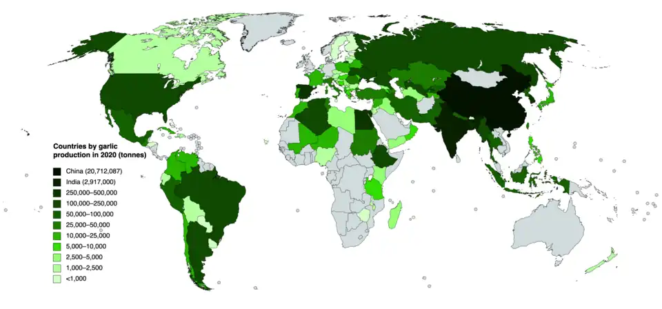Countries by garlic production in 2020 This is a list of countries by garlic production from 2016 to 2022, based on data from the Food and Agriculture Organization Corporate Statistical Database.[1] The total world production for garlic in 2022 was 29,149,438 metric tonnes, up slightly from 29,028,027 tonnes in 2021.[1] China was by far the largest producer, accounting for 73% of world production at 21,337,798[1] tonnes.