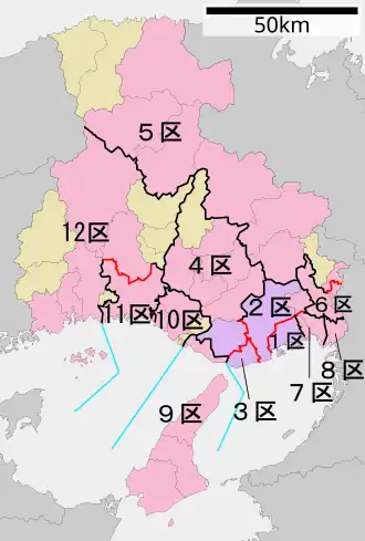 - ^ a b c d e f g h i j k l m n o p q r s t u v w x y z aa ab ac ad ae af ag ah ai aj ak al am an ao ap aq ar as at au av aw ax ay az ba bb bc bd be bf bg bh bi bj bk bl bm bn bo bp bq br bs bt bu bv bw bx by bz ca cb cc cd ce cf cg ch ci cj ck cl cm cn co cp cq cr cs ct cu cv cw cx cy cz da db dc dd de df dg dh di dj dk dl dm dn do dp dq dr ds dt du dv dw dx dy dz ea eb Redistricted in 2022 (First effective in the 2024 Japanese General Election)