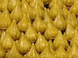 This is a list of notable dumplings. Dumpling is a broad class of dishes that consist of pieces of dough (made from a variety of starch sources) wrapped around a filling, or of dough with no filling.[1][2] The dough can be based on bread, flour or potatoes, and may be filled with meat, fish, cheese, vegetables, fruits or sweets. Dumplings may be prepared using a variety of methods, including baking, boiling, frying, simmering or steaming and are found in many world cuisines. Some definitions rule out baking and frying to exclude items like fritters and other pastries that are generally not regarded as dumplings by most individuals.[1]