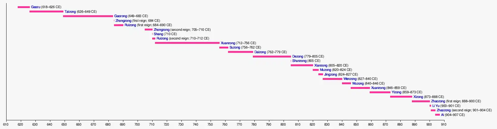 | Yizong 懿宗 | Li Cui 李漼 | 13 September 859 | 15 August 873 | Emperor Zhaosheng 昭聖皇帝 |