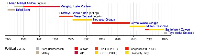 Since the formal establishment of the office of president in 1987, there have been 6 official presidents. The president is the head of state of Ethiopia. The current president is Taye Atske Selassie, elected on 7 October 2024 by members of the Federal Parliamentary Assembly.[1]