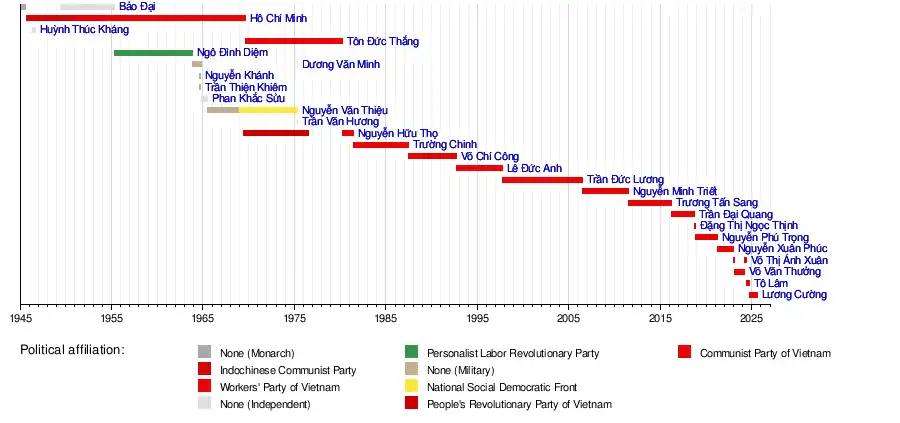 | 1 | | Hồ Chí Minh (1890–1969) | 2 September 1945 | 2 September 1969 | 24 years | Indochinese Communist Party (until 1951) Worker's Party of Vietnam (from 1951) |