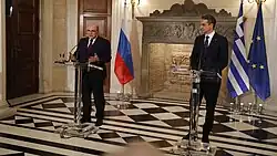 2021 Mishustin with Prime Minister of Greece Kyriakos Mitsotakis , in Athens , on 24 March 2021 Country Areas visited Date(s) Notes Kazakhstan Almaty 4–5 February Working visit, participation in the session of the Eurasian Intergovernmental Council.[ 5] Greece Athens 24–26 March Working visit, represented Russia at the bicentennial celebrations of the Greek War of Independence .[ 6] [ 7] Belarus Minsk 16 April Working visit, meeting with Belarusian President Alexander Lukashenko and Prime Minister Roman Golovchenko .[ 8] Belarus Minsk 27–28 May Working visit, participation in the session of the CIS Council of the heads of government.[ 9] Kazakhstan Nur-Sultan 18–19 August Working visit, meeting with Kazakh President Kassym-Jomart Tokayev , former President Nursultan Nazarbayev and Prime Minister Asqar Mamin .[ 10] Kyrgyzstan Cholpon-Ata 19–20 August Working visit, participation in the session of the Eurasian Intergovernmental Council.[ 11] Belarus Minsk 10 September Working visit, participation in the session of the Union State Council of Ministers.[ 12] Armenia Yerevan 18–19 November Working visit, participation in the session of the Eurasian Intergovernmental Council.[ 13] United Arab Emirates Dubai 4 December Working visit, participation in the opening ceremony of the National Day of Russia at Expo 2020 .[ 14]