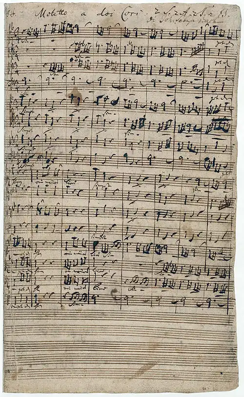 Bach's motets are his only vocal works that stayed in the canon without interruption between his death in 1750 and the 19th-century Bach Revival.[2] In the early 19th century, six motets (BWV 225, 228, Anh. 159, 229, 227, 226)[3][4] were among Bach's first printed music, after the second half of the 18th century when the only vocal music by Bach that was printed were collections of his four-part chorales.[5]