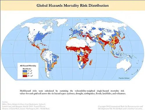 Global multihazard mortality risks and distribution (2005) for cyclones, drought, earthquakes, floods, landslides, and volcanoes (excluding heat waves, snowstorms, and other deadly hazards). A natural disaster is a sudden event that causes widespread destruction, major collateral damage, or loss of life, brought about by forces other than the acts of human beings. A natural disaster might be caused by earthquakes, flooding, volcanic eruption, landslide, hurricanes, etc. To be classified as a disaster, it must have profound environmental effects and/or loss of life and frequently causes financial loss.