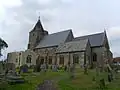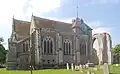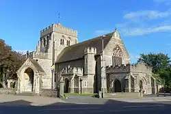 Sussex—the Kingdom of the South Saxons—was one of the last parts of England to be Christianised. It was isolated from other parts of the country because of the thick forest that covered it. When St Wilfrid and his missionaries brought Christianity to the area in the 7th century, they arrived by sea.[3] The new religion quickly spread; the longest established churches in the present Rother area are apparently St Peter's Church in Bexhill's old town and All Saints Church at Icklesham, both founded in 772 (but no 8th-century fabric remains at either location).[4][5] Many more churches were built in the Saxon era, but most were either superseded by larger Norman buildings between the 11th and 13th centuries—as at Sedlescombe[6] and Whatlington[5]—or substantially added to, as at Icklesham.[7] Many places also gained their first church during this period, and the size and opulence of some (such as Ticehurst[8] and Salehurst)[9] reflect the area's iron-industry wealth at the time.[8] Nevertheless, some parishes were initially very large: for example, both Bodiam and Etchingham were served from Salehurst parish church until their own churches were built in the 14th century.[10][11]