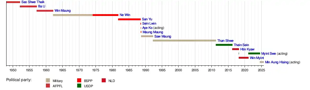 | — | | Ne Win နေဝင်း (1911–2002) | 2 March 1962 | 2 March 1974 | 12 years | Military / Burma Socialist Programme Party | ||