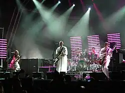 On July 21, 2005, Corgan stated in full-page advertisements in the Chicago Tribune and Chicago Sun-Times that he planned to reunite the band.[9] On April 20, 2006, the band's official website confirmed the reunion.[10] Corgan and Chamberlin were verified as participants in the reunion, but it was unclear whether other former members of the band would participate. In April 2007, Iha and Auf der Maur separately confirmed that they were not taking part in the reunion.[11][12] Wretzky did not make an announcement, but Chamberlin would later state that Iha and Wretzky "didn't want to be a part of" the reunion.[13] The Smashing Pumpkins performed live for the first time since 2000 on May 22, 2007, in Paris, France, with new members Jeff Schroeder on guitar and Ginger Reyes on bass guitar, as well as keyboardist Lisa Harriton.[14]