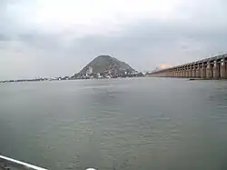 View of Kanaka Durga Temple from Parakasam Barrage in Vijayawada.