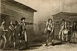 In addition to threatening to cut off peoples' ears, Jackson also repeatedly menaced peoples' houses with fire: he wrote a U.S. Senator that "the wrath and indignation of our citizens will...involve Silas Dinsmore in the flames of his agency house."[26] According to the slave narrative of "James Roberts," following the Battle of New Orleans, Andrew Jackson spoke to his soldiers and hundreds of slaves had been impressed to dig earthworks and declared (in part), "Before a slave of mine should go free, I would put him in a barn and burn him alive..."[27] During Indian removal he told Secretary of War Eaton to tell the Chicksaw agent to tell squatters on Chickasaw land that their houses would be burned down if they did not wait to claim land until the U.S. government signaled it was time.[28]