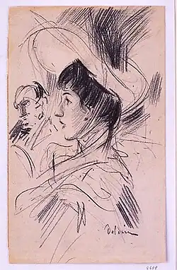 Boldini first attained success as a portraitist in London, completing portraits of premier members of English society including Lady Holland and the Duchess of Westminster.[2] From 1872, he lived in Paris, where he became a friend of Edgar Degas and became the most fashionable portrait painter in Paris in the late 19th century, with a dashing style of painting which shows some Macchiaioli influence and a brio reminiscent of the work of younger artists, such as John Singer Sargent and Paul Helleu.[3]
