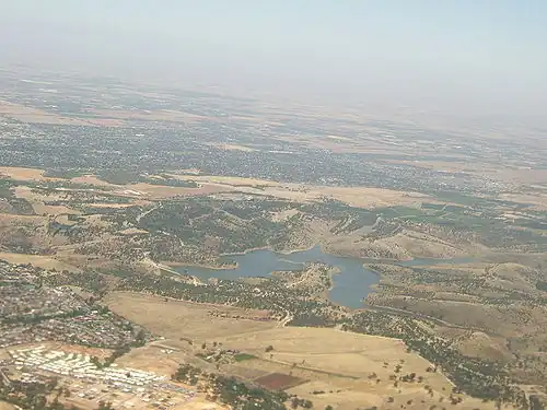 Little Para Reservoir. The image is looking towards the northwest. The built-up area in the bottom left corner is Greenwith. The dark dotted areas in the background are the northern suburbs of Adelaide, corresponding to the City of Playford centred around Elizabeth and the Adelaide Plains are further in the background. | |