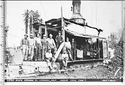 The location was formerly a company town for sawmill workers of the Little River Redwood Company, organized in 1893 by owners in Ottawa and western New York. Company headquarters were in Tonawanda. The California sawmill commenced operations in 1908.[3] The post office opened in 1909 was named for property owner Conrad Bulwinkle. In 1922 the community was renamed for Little River Redwood Company president Levi Crannell.[2] The town was served by the Trinidad extension of the Northwestern Pacific Railroad from 1911 to 1933.[4] Little River Redwood Company also built the Humboldt Northern Railway to transfer company freight along the Pacific coast directly to Samoa, California.[5] A 1925 map of Crannell presents the various saw and planning mills, as well as dams and blockades on the Little River for logging transport. The town itself featured tenement housing, offices, and a General Store.[6]