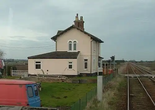 The station was opened on 2 October 1848[2] to serve the hamlet of Little Steeping. It was constructed by Peto and Betts civil engineering contractors who, in January 1848, had taken over the contract to construct the section of the East Lincolnshire Railway between Louth and Boston from John Waring and Sons.[3] This section was the last to be completed in September 1848 at an agreed cost of £123,000 (equivalent to £15,600,000 in 2023).[4][3] The station was provided with two platforms: a signal box was built on the up platform and the main station buildings were on the down platform.[5] The signal box was situated near the level crossing over a minor road linking Little Steeping with Great Steeping to the north.[5] A farm crossing at Ings Lane to the north of the station at grid reference TF445623 was the location of a fatal accident in November 1897 when Tom Odlin was killed whilst crossing the line in foggy weather with a corn wagon drawn by two horses, the wagon being pushed down the line for some distance.[6]