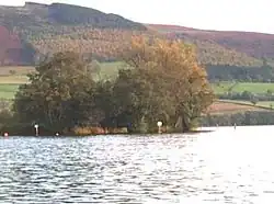 The crannog is a small artificial island about 40 metres (130 ft) from the north shore. It is constructed of massive planks of oak behind which was built a dwelling platform formed from layers of stone, soil and brushwood.[9] It was investigated by archaeologists from the National Museum of Wales between 1989 and 1993. Finds included a high quality textile and a bronze hinge from an 8th–9th century reliquary decorated in a style similar to that seen in Ireland.[10] The 1993 dig was joined by the TV series Time Team and featured in series one, episode four in 1994.[11] In 2005, works were carried out to protect the island from erosion.[10]