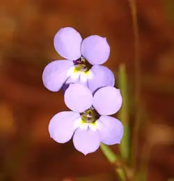 Lobelia douglasiana is a twining, slender annual 0.07โ0.15 m (2.8 in โ 5.9 in) high with white or blue flowers. Flowering occurs from April to August.[2]