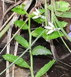 The small perennial herb blooms between January and June producing white flowers.