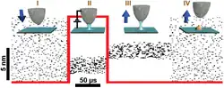 Currently, local oxidation experiments are performed with an atomic force microscope operated in contact or noncontact mode with additional circuits to apply voltage pulses between tip and sample. The local oxidation process is mediated by the formation of a water meniscus.[4]
