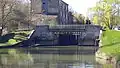 The lock gates were originally made of oak in the traditional mitre pattern with balance beams and each gate had a single large wooden sluice drawn up by a vertical screw.[1] The introduction of electric and hydraulic systems for both the lifting of the sluices and the opening of the gates has seen the removal of the balance beams and modern gates are of metal construction.