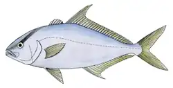 The longfin yellowtail (Seriola rivoliana),[2] also known as the almaco or silvercoat jack, deep-water, falcate, European or highfin amberjack, rock salmon, longfin or yellow kingfish, is a game fish of the family Carangidae; they are in the same family as yellowtail and amberjack.[3] They are carnivorous and feed, both day and night, on other, smaller fish, such as baitfish, small squid, octopus, crab and shrimp.[4] The flesh is thick and dense, like tuna, and easily may be passed off for white albacore if prepared as sushi.[3]