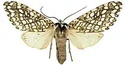 The length of the forewings is about 25 mm. The ground colour is light beige, largely speckled with brown and ornamented with bands of white rounded spots underlined with brown. The basal band formed by a unique spot on the costa. The postbasal, antemedian, median, postmedian and subterminal bands are formed by an alignment of white spots underlined with brown and intercalating between veins. The postbasal band is broken. The antemedian is formed by two white spots and two brown spots. The median band is formed by two spots on the reniform spot. The postmedian is almost straight and complete. The terminal band is formed by irregular white spots sometimes fused with the sinuous subterminal spots. The hindwing is white and semi-translucent. The anal margin is more densely scaled with brown scales. The fringe is checkered white and brownish.[1]