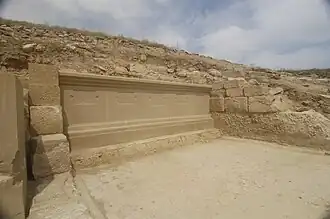 Mausoleum of the Atilii - popularly called the altar of the Moors Its inscriptions indicate that a woman named Atilia Festa built it, in life, for her grandfather Gaius Atilius Genialis, for her father Lucius Atilius Festus and for herself. This facade is one of the ornamental jewels of Roman funerary art in the Iberian Peninsula.[71] In January 2016, Pablo Serrano, infographics artist of the Los Bañales project, carried out a 3D reconstruction of the monument based on detailed photogrammetric documentation and comparison with similar monuments and Roman funerary culture. This reconstruction is hosted on the Los Bañales video channel.[72]