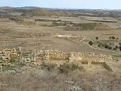 El Pueyo was completely occupied by houses of pre-Roman era, and today you can intuit, observing from a high point, the different blocks of houses -insulae -. In the facades of these houses, which in some cases had to have low commercial -tabernae-, you can see well squared and large blocks located in key areas of the building, while the dividing sockets of the interior were made with hewn stones and perpendicular orthostats to give greater consistency to the wall. Its atypical structure for the Roman model suggests that they are houses adapted to the different periods of survival of the population in this area of the city, from centuries before acculturation with Rome and until centuries after the dismantling of the public structures of the Roman city.[65] Excavated by José Galiay[66] and documented again by Antonio Beltrán,[67] a part of the second mentioned terrace, is currently under study again, since in recent excavations a section of the wall that surrounded this terrace was discovered, with the base of one of its towers and even the doorway of a wall.[68]