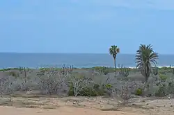 The Río San José stops just shy of the ocean, with a one km long sand bar creating an estuary, the third largest in Mexico.[20] This pooling of brackish water has created an oasis in the surrounding Sarcocaule desert. The Río San José flows largely underground for 40 miles (64 km) from its origin in the Sierra de la Laguna (Laguna Mountains), although its Miramonte River tributary adds almost an additional 10 miles (16 km). Its tributaries flow down the eastern side of the sierra and include Santa Rosa, Santa Lázaro, San Miguel, San Ignacio (at La Palma), Caduaño, Miraflores and San Bernard.[21]