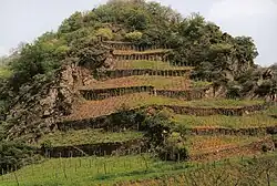 In the late 19th century the terracing of valley sides along the Lower Moselle – occasionally almost to the hilltops – probably reached its greatest extent. The successive terracing uphill also occurred especially in the terroirs, which from the earliest times were known for highly sought after wines that commanded high prices. In order to produce greater quantities, terraces were also laid in the side valleys and on less favourable sites. Around 1880 the Province of Koblenz still named around 2,500 hectares of vineyard land, mainly on steep hillsides.[13]
