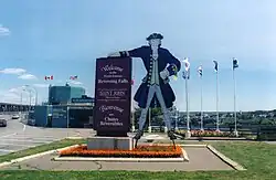 The Loyalist Man is an iconic sign located near the Reversing Falls in Saint John, New Brunswick, Canada. The figure was conceived of by Jim Stackhouse and painted by Ron Howard.[1] It represents a Loyalist soldier from the American Revolution, as many of Saint John's early settlers were Loyalists. The sign was first displayed in the 1950s though it has been taken out of use on occasion. It was originally created to encourage residents to shop at local stores.[2] In 2005 the city replaced it with a "generic explorer figure" in an attempt to refurbish the city's image[3] but it eventually returned. In 2014 the sign was removed temporarily for repairs after it lost a leg. The City of Saint John has used the image on other signs, pins and various marketing materials over the years. Loyalist Man was also featured as a superheroic character in the Interaction School of Performing Arts' The Saint John History Mystery, as portrayed by Elijah Wilcott.[4]