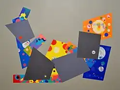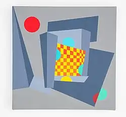 Cox has exhibited her paintings in the UK and internationally, including an exhibition of British painters in China,[5][6][7][8] and has curated exhibitions in London.[9][10] Andy Parkinson wrote of her work, "Lucy Cox's playful geometric arrangements, almost inhabiting a believable three dimensional space, seem to celebrate the ways in which colour creates spatial ambiguities and irregularities".[11] Sharples[3] described Cox's paintings as compositions which "reveal vivid organic and geometric shapes, gradations of colour, exchanges and explorations of the figure/ground relationship between translucency and opaqueness", while Robert Priseman describes her abstract paintings as "juxtaposing the autonomy of geometry with repetition and spontaneity".[12] She is a member of Contemporary British Painting[2] and on the advisory board of The Priseman Seabrook Collections.[13]