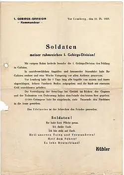 At the start of World War II, Kübler's division was involved in the invasion of Poland as part of the 14th Army, commencing on 1 September 1939. It fought in the Carpathian Mountains, distinguishing itself during the capture of the Dukla Pass.[5] On 27 October, Kübler was awarded the Knight's Cross of the Iron Cross for his role in the Polish campaign.[6] Then on 1 December 1939 he was promoted to Generalleutnant.[3] During the invasion of France and the Low Countries in May 1940, Kübler's division was not heavily committed, fighting on the Franco-Belgian border and crossing the Maas on 15 May. The division was stationed around Arras after the fall of France, as it had been selected to form part of the invasion force for Operation Sealion, the invasion of the United Kingdom. After that operation was postponed, on 25 October 1940 Kübler was appointed to command the XXXXIX Mountain Corps,[3] which included the 1st Mountain Division. His corps was earmarked for Operation Felix, the planned capture of Gibraltar, but that operation was also called off.[5] Due to the disfigurement caused by the wounds he suffered during World War I, Kübler became known to his troops as "Limping Nurmi", a reference to the Finnish long-distance runner Paavo Nurmi.[7]