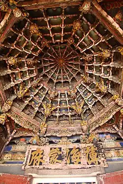 The front or Sanchuan Hall[8] has woodwork notably different from that elsewhere in the complex because it was added from Lukang's city god temple in 1933 when the Japanese began to destroy it as part of an urban replanning. The front hall's coffered ceiling includes sculptures of the Eight Immortals and paintings of the "Four Loves": fishing, woodcutting, planting, and reading. At its apex is a blossoming lotus. Its four corners are protected by stone foo dogs.[10] The ceiling's plaque was written by Wang Lan-pei in 1830 and invokes Mazu's protection (Bo Hai Meng Xiu). It is surmounted by a pair of toads carved by Shi Li, one holding a chrysanthemum in its teeth symbolizing long life and the other holding a camellia symbolizing a long and prosperous spring.[10] Between the pillars are four beasts with dragon heads, fish tails, and bird wings carved by Lee Huan-mei. They are thought to offer the temple protection from fire.[10]