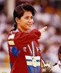 De Vega first made an impact at the 1981 Southeast Asian Games (SEA Games) held in Manila with gold medal performances in the 200 and 400 meter events exceeding records set at the Asian Games.[10] As Asia's sprint queen, she ran away with the gold medal in the 100-meter dash in the 1982 Asian Games in New Delhi[5] and duplicated the feat in the same event at the 1986 edition in Seoul[5] where she clocked 11.53 seconds.[11] She developed a rivalry with Indian athlete P. T. Usha.[12][13][14][15]