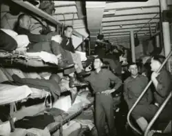 - ^ This combined with the troop ships operating out of Army Ports of Embarkation at times led embarked personnel and others to term any such ships "United States Army Transport" (USAT). The term officially applied to ships owned or under bareboat charter and crewed by Army or Army contract personnel. In soldier or press accounts Torrens is sometimes seen mistakenly as U.S.A.T. Torrens. The photo of the officer's bunkroom below is so miscaptioned in the original by the Signal Corps.