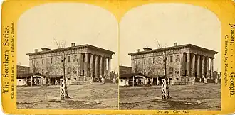 The Classical Revival structure was built in 1837 as the headquarters of the Monroe Railroad & Banking Co., before later serving as City Hall. During the American Civil War it was called into duty as a military hospital beginning in 1863. Its greatest notoriety came the next year, when Governor Joseph E. Brown, fleeing the Union army's advance into Milledgeville, moved the state capital to Macon and set up an office at City Hall, beginning November 18, 1864. The General Assembly met in the building the following February and March, the last legislative session under the Confederate States of America. The building ceased to serve as capitol on March 11, 1865.