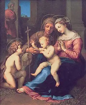 It depicts Saints Mary and Elizabeth with the baby Jesus and a genuflecting Saint John holding a cross of reeds. Jesus, assisted by Saint Elizabeth, appears to be blessing Saint John. In the shadows stands Saint Joseph.