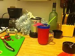 - two handled cups, called by the manufacturer "Party Mugs", which can be used to blend individual drinks (also with colored "Comfort Rings" that screw over the threads),