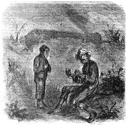 The novel begins with young Pip visiting the graves of his parents and brothers, where he is surprised by Magwitch: "[a] fearful man, all in coarse gray, with a great iron on his leg. A man with no hat, and with broken shoes, and with an old rag tied round his head. A man who had been soaked in water, and smothered in mud, and lamed by stones, and cut by flints, and stung by nettles, and torn by briars; who limped and shivered, and glared and growled; and whose teeth chattered in his head as he seized me by the chin."[1]