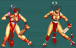 As her design was refined for The King of Fighters, they aimed to emphasize her sex appeal, modelling her breasts after model Fumie Hosokawa, while her hips were based on those of media personality Ai Iijima.[17] During work on The King of Fighters '94, the person working on Mai's sprites, C. A. C Yamaski, asked the development head if he could increase the number of sprites for her standing idle animation.[22][23] The latter agreed due to having extra space on the game's ROM, but was surprised upon seeing the results: while in earlier games her breasts were given a slight amount of jiggle in her animations, the sprite artist had emphasized the movement of her breasts dramatically. While the animation was censored in Western releases of the game, this aspect endured into subsequent titles and the team felt this was a significant factor in her enduring popularity.[22][12]
