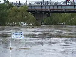 The first bridge to link West Maitland with what is now the suburb of Lorn was opened in 1869 and named in honour of the then Governor of New South Wales, the 4th Earl of Belmore.[19] Although the bridge proved vital to the city's development, the floods of 1893, 1913 and 1930 began to heighten the need for a new bridge that could withstand periodic flooding. A second Belmore Bridge, designed to withstand the impact of debris during floods, was built adjacent to the 1869 bridge in 1964. The new bridge, which redirected traffic away from St Andrews Street to a new intersection at the Maitland Court House, is one of the city's three main river crossings.[19]
