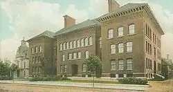 Malden High School was established in 1857 by the school committee after a vote in favor for the establishment.[3] The school first started in the Centre Grammar School Building of Pleasant Street with Joseph H. Noyes as Principal, Annie L. Woodford as his assistant and 38 students, which would later grow to 57 over the year.[3] The school grew quickly taking the lower story of the townhouse two years later, started library on 1863, and faced increasing overcrowding until 1872, when Edward Hyde Rice was principal, and where a new building was erected on Salem Street at the cost of $100,000.[4]