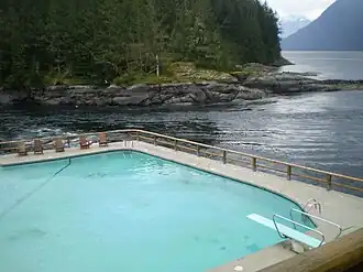 The Malibu Rapids forms the entrance to Princess Louisa Inlet and is also connected to the Jervis Inlet. The tidal flow of both inlets pass through this narrow and shallow passage that creates a fast moving (approximately 9 kn or 17 km/h) and strong tidal rapids during the peak flows. At slack tide, the entrance is virtually flat calm similar to the Skookumchuck Narrows near the entrance of the Jervis Inlet.
