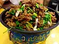 | Instant-boiled mutton | ![]() | 涮羊肉 | 涮羊肉 | shuàn yángròu | A variant of hot pot which usually features boiled water as base (no additional spices) and mutton as the main type of meat. |