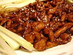 | Moo shu pork | ![]() | 木須肉 | 木须肉 | mùxūròu | Literally "wood shavings meat" |