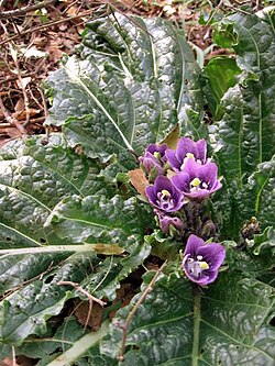 As of 2015, Mandragora officinarum has three or four different circumscriptions (see Taxonomy below). The description below applies to a broad circumscription, used in a 1998 revision of the genus, in which the name is used for all the plants native to Mediterranean region.[2] Thus defined, Mandragora officinarum is a very variable perennial herbaceous plant with a long thick root, often branched. It has almost no stem, the leaves being borne in a basal rosette. The leaves are very variable in size and shape, with a maximum length of 45 cm (18 in). They are usually either elliptical in shape or wider towards the end (obovate), with varying degrees of hairiness.[2]