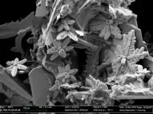 |  Electron micrograph of MnSi2 stars grown on Si plates | |