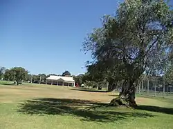 View of Manners Hill Park showing the pavilion, peppermint trees and a tennis court | |