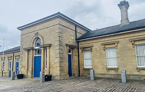 The hotel is adjacent to the station building. Registered as a grade II listed building from 1978,[16] it was originally a mental asylum named Broom House,[17] built in the early 1800s, then purchased by the Midland Railway Company and converted into a hotel in 1862.[18][19][20][21][22]
